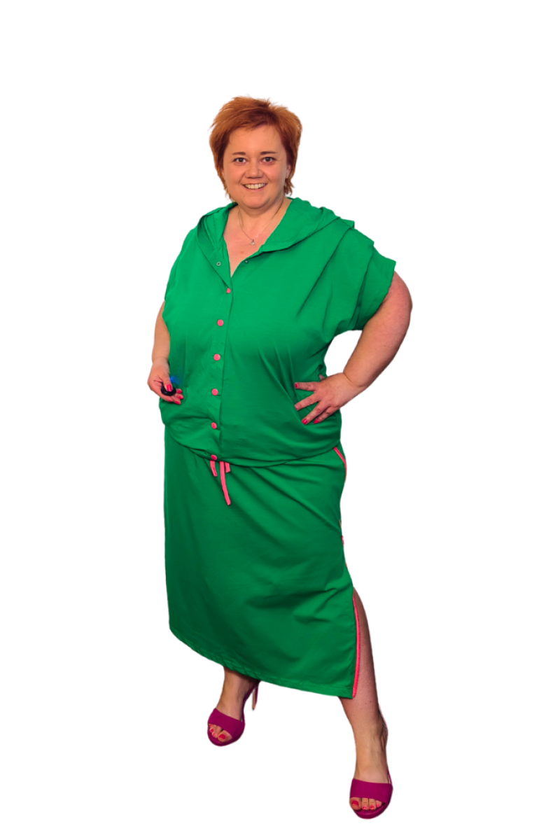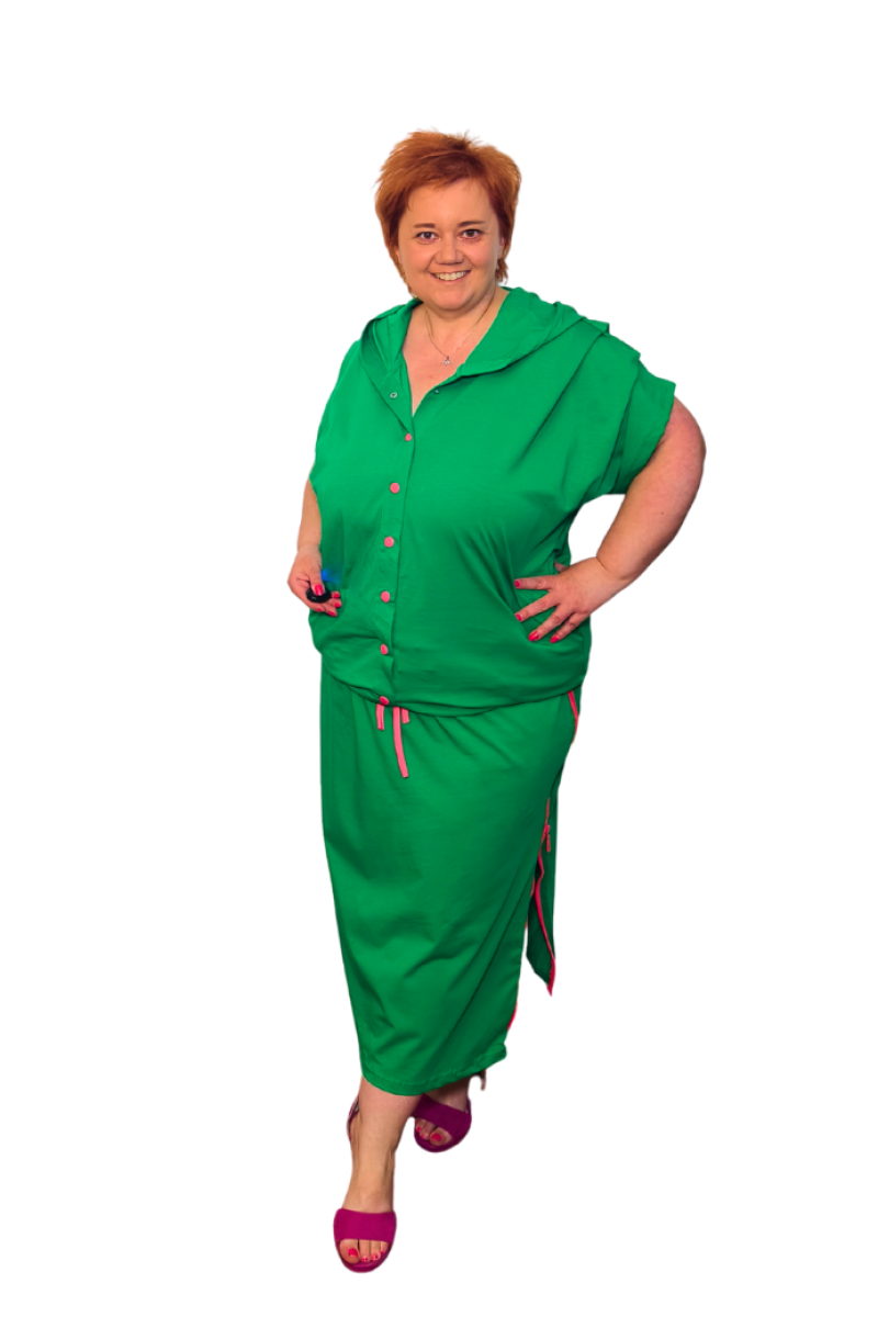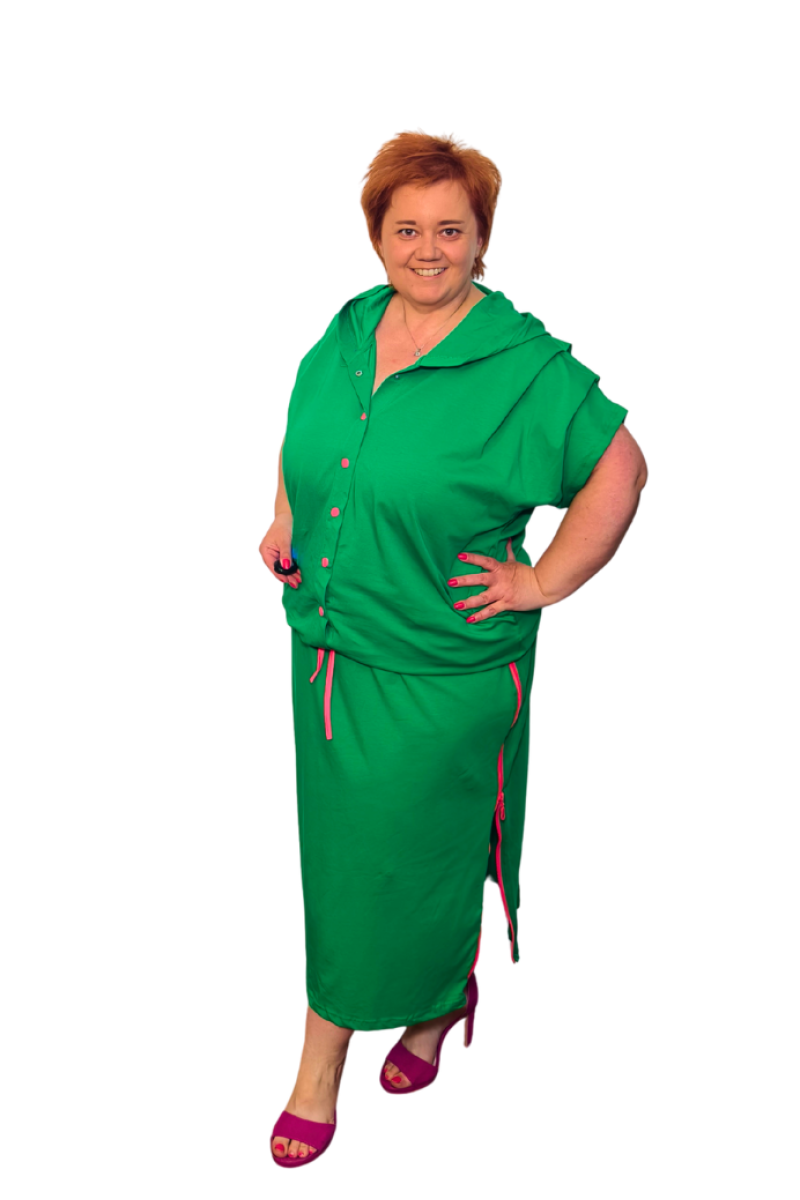 Jednofarebný základ tejto sukňovej súpravy je doplnený neónovými detailmi, ktoré mu dodávajú šmrnc.