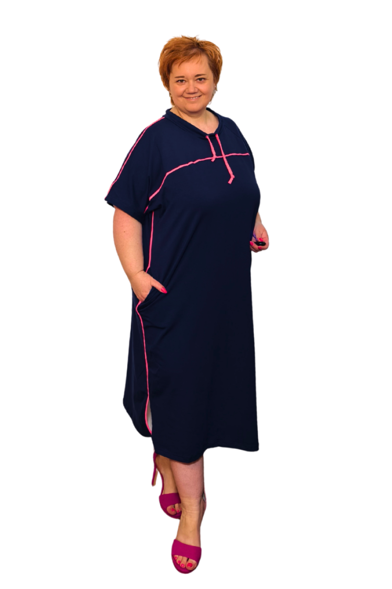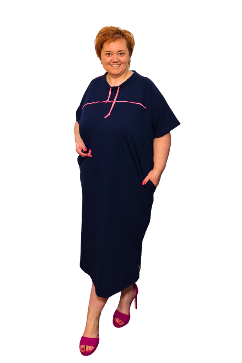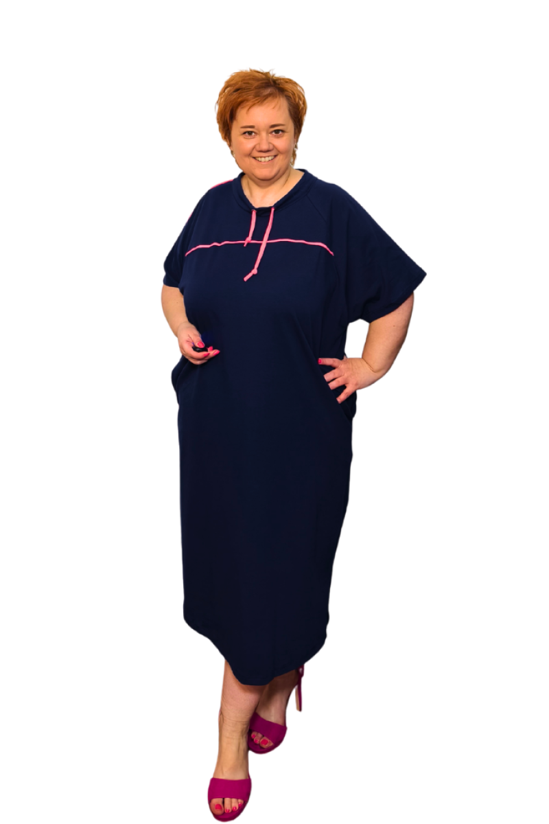 Bavlnené tmavomodré šaty s ružovou šnúrkou